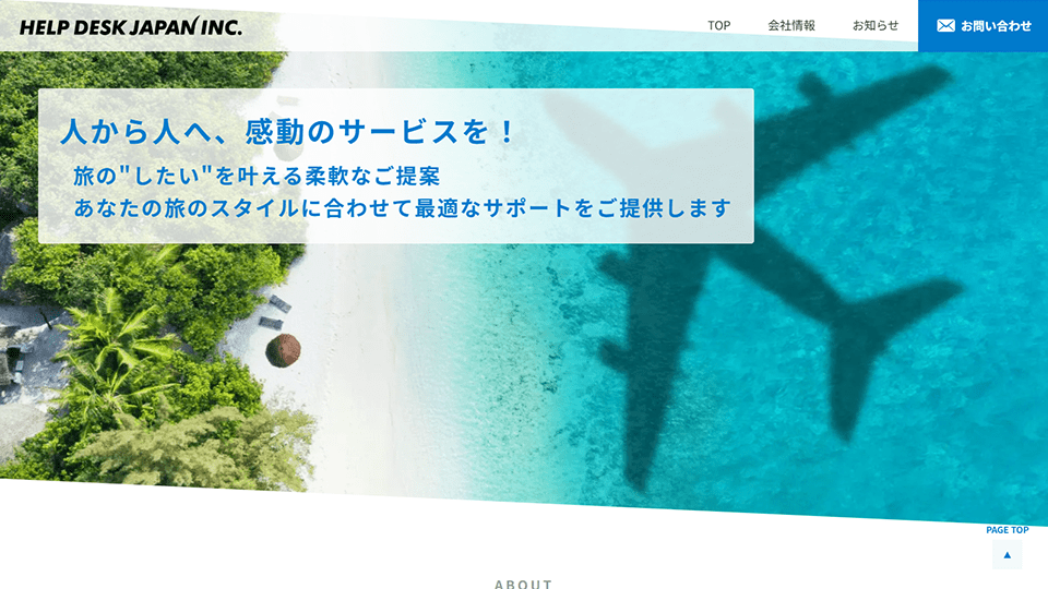 千葉県松戸市を拠点に旅行業を営んでいるヘルプデスクジャパンさまのコーポレートサイトを制作いたしました。「旅専門のヘルプデスク」として信頼感や安心感のあるデザインを意識しつつ、旅の楽しさが伝わるような、統一感がありながらも明るく見えるサイトを目指しました。